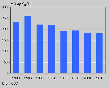 In 2000 produceerde de Nederlandse veestapel 183 miljoen kg fosfaat. Dit is ruim 4 procent (8 miljoen kg) minder dan in 1999. De daling is voornamelijk veroorzaakt door het afgenomen aantal runderen: rundvee produceert ruim 50 procent van de totale hoeveelheid fosfaat. In 2000 lag de uitscheiding van fosfaat weer op het niveau van begin jaren zeventig; bijna 30 procent onder die van het topjaar 1986. De fosfaatuitscheiding daalde in 2000 meer dan in 1998 en 1999. Voorlopige cijfers voor 2001 tonen een verdere daling van de fosfaatuitscheiding met 3 miljoen kg.