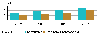 Tussen 2007 en 2013 is het aantal restaurants in Nederland voortdurend gestegen, alleen in 2011 niet. Begin 2007 waren er ruim 11 duizend restaurants. Begin 2013 waren dat er bijna 13 duizend. Doordat het aantal restaurants harder is gestegen dan de omzet is de gemiddelde omzet per restaurant juist gedaald. Daarnaast nam het aantal snackbars en lunchrooms de afgelopen jaren toe met ruim 17 procent. Het omzetniveau van de snackbars daalde tijdens de crisis minder hard dan van de restaurants. Ook voor de snackbars geldt dat de gemiddelde omzet per vestiging is gedaald doordat het aantal vestigingen harder is gestegen dan de omzet.