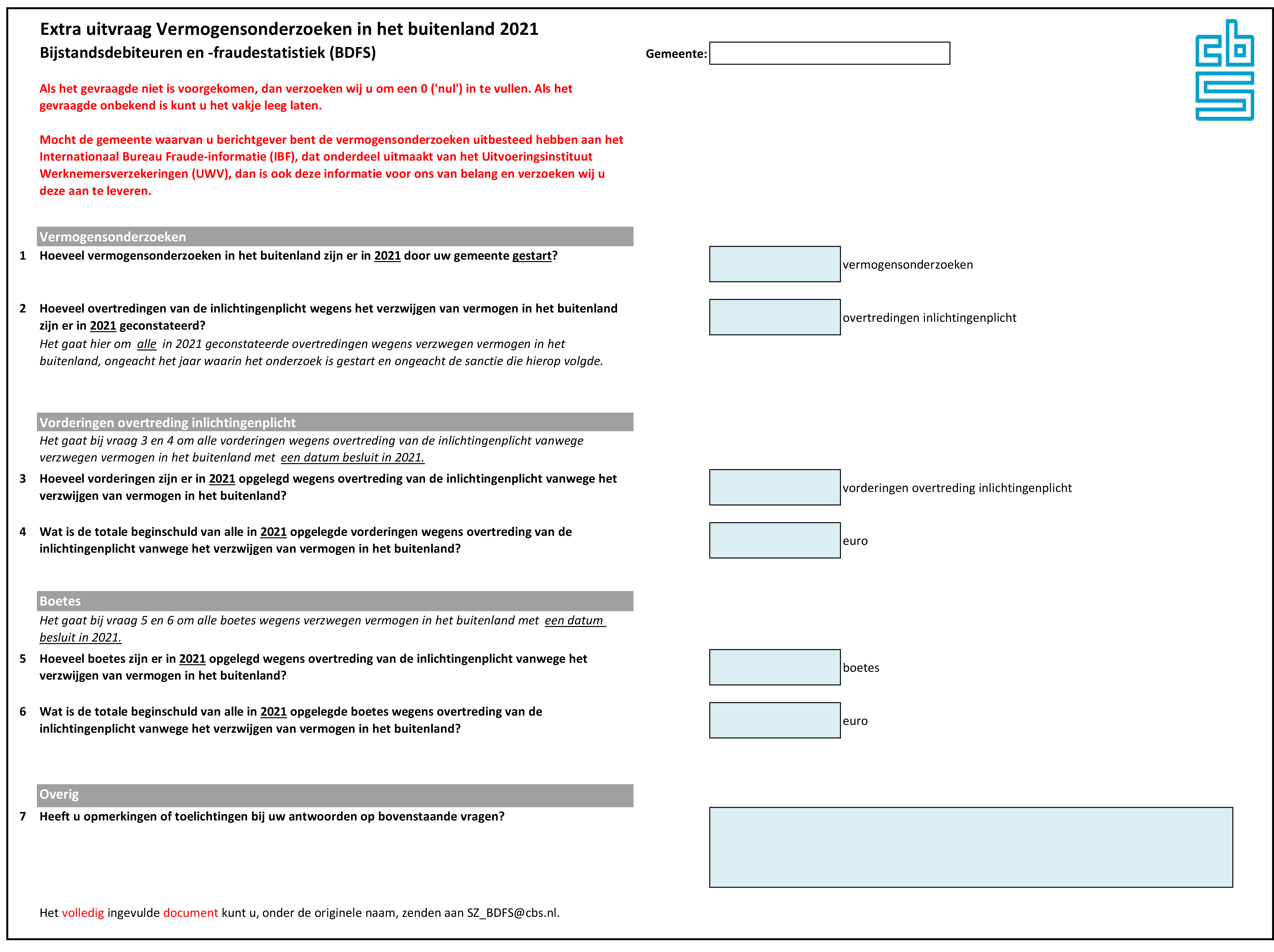 Het ministerie van Sociale Zaken en Werkgelegenheid (SZW) wil meer inzicht in de uitvoering van vermogensonderzoeken in het buitenland door gemeenten en de omvang hiervan. Hiertoe heeft het CBS in samenspraak met SZW eind 2019/begin 2020 voor het eerst middels een enquête onder alle gemeenten in Nederland in kaart gebracht hoe vaak zij in 2018 een vermogensonderzoek in het buitenland zijn gestart, hoe vaak dit heeft geleid tot een (boete)vordering en hoe groot de totale beginschuld is die hiermee gemoeid is. Voor het verslagjaar 2019 is dit onderzoek in 2021 herhaald.