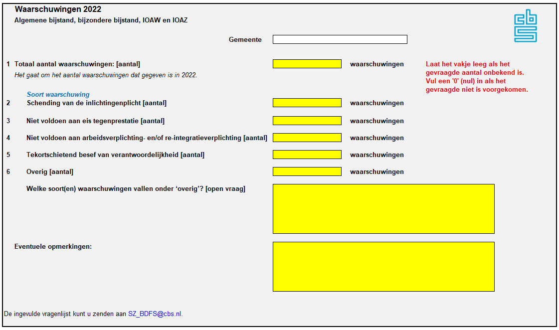 Het aantal gegeven waarschuwingen wordt niet uitgevraagd in de Bijstandsdebiteuren en –fraudestatistiek (BDFS) of de Bijstandsuitkeringenstatistiek (BUS). Daarom heeft het CBS vanaf 2017 jaarlijks een enquête uitgezet bij gemeenten om inzicht te krijgen in het aantal waarschuwingen dat vanaf verslagjaar 2016 is afgegeven. Dit onderzoek is in 2023 herhaald voor het verslagjaar 2022.