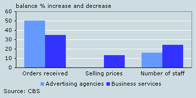 Advertising agencies showed a decline in turnover of almost 1 percent compared to the third quarter of 2006. The second quarter of 2007, turnover saw a minor recovery of half a percent. As yet, there seems to be no further recovery. The last time the advertising branch experienced a healthy turnover growth was the closing quarter of 2006. But then again, advertising agencies had just gone through two consecutive quarters with diminishing turnover. From the first quarter of 2007 onwards, turnover has been very changeable. The stable positive situation, as seen in 2005 for this branch, appears unlikely to return in the short run. With this, advertising remains the most poorly performing branch of business services overall.