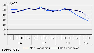 Some 27 thousand new vacancies were created in business services in the second quarter. One year previously, this number was twice as high. Demand for new staff decreased considerably in all branches. The biggest decrease occurred in computer services, where it fell by 70 percent to 3 thousand, the lowest number since 2004. Vacancies filled in the sector numbered 33 thousand in the second quarter of 2009, 18 thousand fewer than in the same period last year. At the end of the second quarter, almost 24 thousand jobs were still open. A year earlier the number of vacant positions was much higher, at 55 thousand.