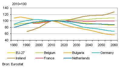 There are substantial differences between the EU member states. In Bulgaria the number of 20-64 year-olds has been decreasing since the mid-1980s. In Germany, too, the decrease started before the turn of the century. In Ireland, on the other hand, the labour force has been growing relatively strongly, and is expected to do so up to 2060, when the number of 20-64 year-olds will be nearly thirty percent higher than it is now. In Germany and the countries in central and eastern Europe the potential labour force is expected to continue to decrease. In Bulgaria and Latvia this may be by as much as over 40 percent. In the Netherlands, the development of the potential labour force resembles that of the EU as a whole. In the period 1980-2010, the Dutch labour force grew by 20 percent, while in 2060 it is expected to be 12 percent smaller than in 2010.