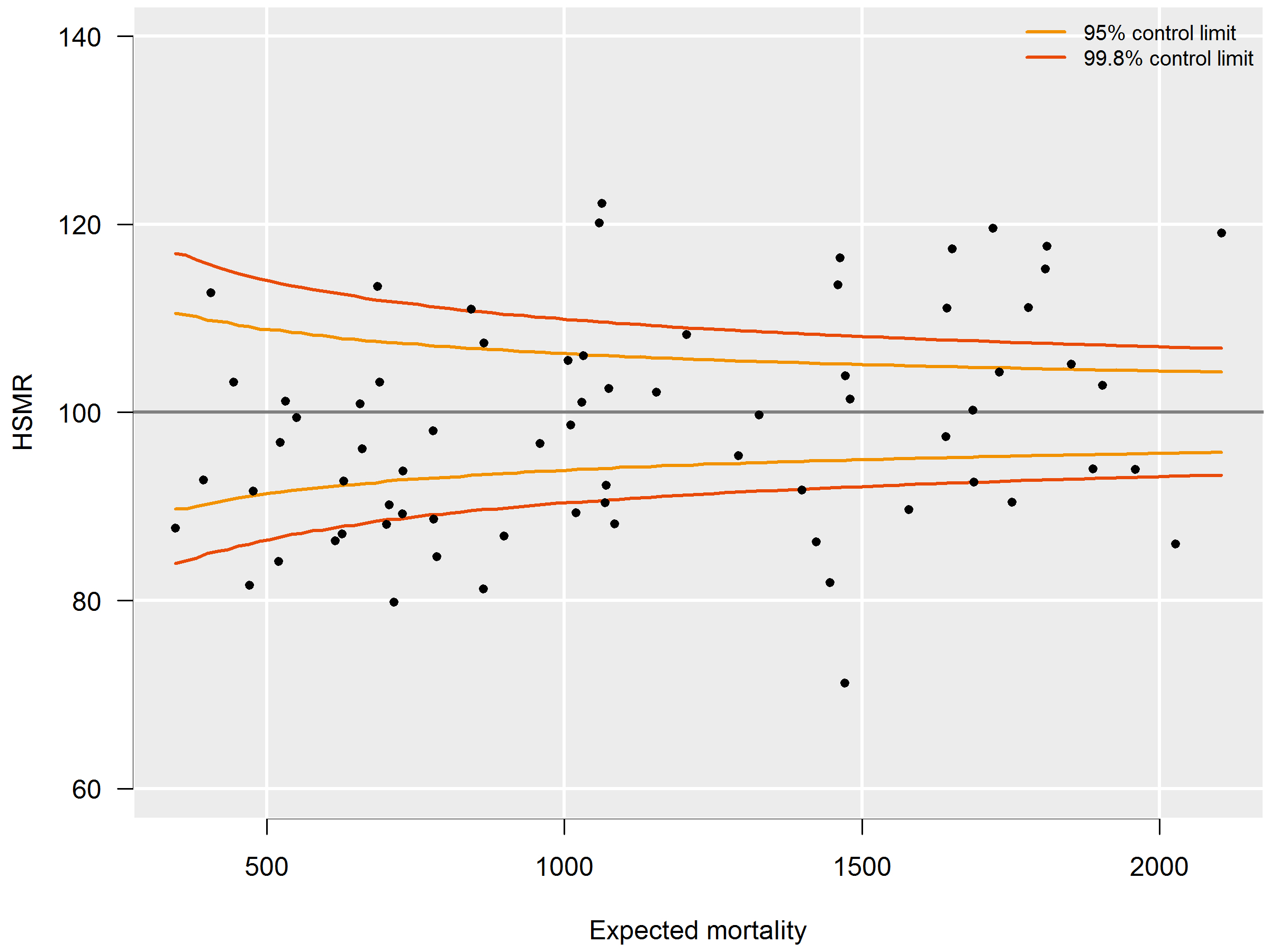 HSMRs can be presented in a funnel plot (see figure 3.6.4 for an example): a plot of hospitals, where the vertical axis represents the HSMRs and the horizontal axis the expected mortalities. Hospitals located above the horizontal axis (HSMR=100) have a higher than expected mortality. As this might be a non-significant feature based on chance, control limits are shown in the plot for each possible expected mortality. HSMRs within these control limits do not deviate significantly from 100. In the case of 95 percent control limits, about 2.5 percent of the points would be above the upper limit if there is no reason for differences between HSMRs, and about 2.5 percent of the points below the lower limit. The same holds, mutatis mutandis, for the 99.8 percent control limits. Here about 0.1 percent of the points would be located above the upper line if there is no reason for differences in standardised mortality rates. Most attention should be paid to this line, as points above this line have a high HSMR that is statistically very significant, which can hardly be the result of chance alone. Hospitals with high (H)SMRs are advised to investigate possible reasons for significantly high values: coding errors, unmeasured case mix variables and/or suboptimal quality of care.
