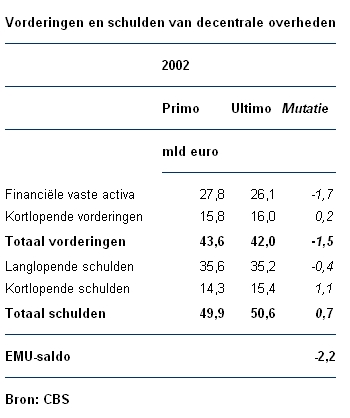 Met de cijfers over de vorderingen en schulden van de decentrale overheden kan het EMU-saldo van deze overheden worden berekend. Voor 2002 komt dit saldo uit op een tekort van 2,2 miljard euro. Uitgedrukt in procenten van het bruto binnenlands product (bbp) is dit -0,5%.