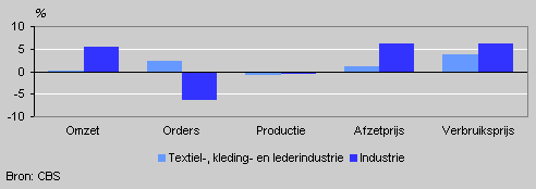 In de textielindustrie lag de verbruiksprijs in maart van dit jaar 4,5 procent boven het niveau van maart 2004. Dit werd slechts ten dele doorberekend in de afzetprijzen die in deze periode ruim 1,5 procent hoger lagen. Hierdoor staan de marges in deze branche onder druk. In het eerste kwartaal van 2005 waren er vergelijkbare verschillen in de ontwikkeling tussen de verbruiksprijs en de afzetprijs.