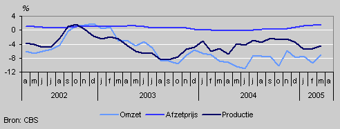 Het volume van de bruto toegevoegde waarde in de branche was in het vierde kwartaal van 2004 bijna 3,5 procent lager dan in het overeenkomstige kwartaal van 2003. De afname op jaarbasis in 2004 was met 3,5 procent van vergelijkbaar niveau. In 2003 daalde het volume van de bruto toegevoegde waarde al met bijna 6 procent.Omzet, productie en prijzen (maart 2002–maart 2005)