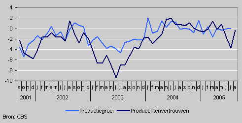 De ondernemers in de industrie waren in augustus flink optimistischer dan in juli. Het producentenvertrouwen is uitgekomen op -0,3. In juli was het vertrouwen nog -3,7. De Nederlandse industrie heeft ook in juni 2005 weer meer omgezet dan een jaar eerder. In vergelijking met juni vorig jaar was de omzet 8 procent hoger. De omzettoename is vooral toe te schrijven aan hogere afzetprijzen. De industriële productie bleef in juni vrijwel ongewijzigd ten opzichte van juni 2004. In het tweede kwartaal van 2005 was het volume van de bruto toegevoegde waarde groter dan het vergelijkbare kwartaal van het voorgaande jaar.