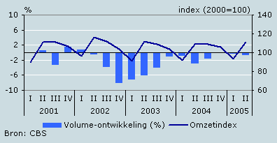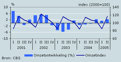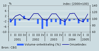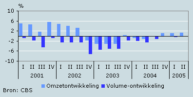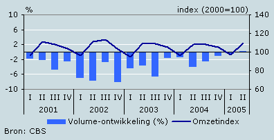 De omzet van cafés nam in het tweede kwartaal van 2005 met 2,1 procent toe ten opzichte van dezelfde periode een jaar eerder. Vooral juni, met fraai zomerweer, had een positieve invloed op de omzetontwikkeling in het tweede kwartaal. De omzet nam in die maand met 6 procent toe in vergelijking met dezelfde maand het jaar ervoor. De prijzen waren in het tweede kwartaal 1,9 procent hoger dan in dezelfde periode vorig jaar. Rekening houdend met deze prijsstijging nam het omzetvolume met 0,2 procent toe. Na een lange reeks van kwartalen met volumedalingen nam het omzetvolume in het tweede kwartaal voor het eerst weer licht toe.