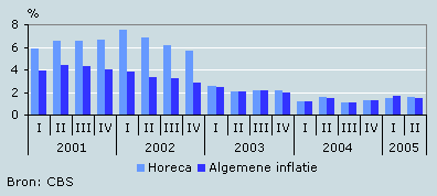 De prijzen in de horeca waren in het tweede kwartaal van 2005 gemiddeld 1,6 procent hoger dan dezelfde periode vorig jaar. Hiermee kwam de prijsontwikkeling net als in 2003 en 2004 rond het niveau van de algemene inflatie in Nederland uit. In 2001 en 2002 waren de prijzen nog gemiddeld 6,5 procent hoger. In 2003 namen de prijzen in de horeca met 2,2 procent toe ten opzichte van het jaar daarvoor en in 2004 was eten en drinken in de horeca 1,3 procent duurder.