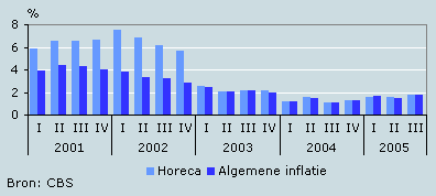 De prijzen in de horeca zijn in het derde kwartaal van 2005 met 1,8 procent gestegen ten opzichte van dezelfde periode een jaar eerder. In de eerste drie kwartalen van 2005 stegen de prijzen in de horeca gemiddeld met 1,6 procent ten opzichte van vergelijkbare periode van vorig jaar. Vanaf 2003 loopt de prijsontwikkeling van de horeca in de pas met de algemene inflatie in Nederland.