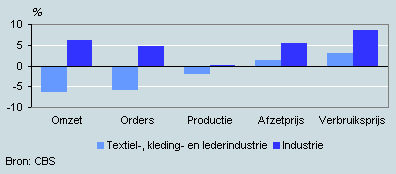 De omzet van de textiel-, kleding- en lederindustrie lag in oktober 2005 opnieuw lager dan in de vergelijkbare maand in 2004. De afzetprijzen lagen in deze periode iets hoger waaruit blijkt dat het omzetvolume sterker daalde dan de omzet zelf. Na een lichtpuntje in de orderontvangsten in de maand augustus, was ook de waarde van de orders in oktober opnieuw fors minder dan in oktober 2004. Al met al geen goede berichten voor deze branche, die al jaren te maken heeft met een dalende omzetten.