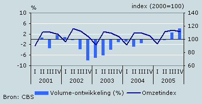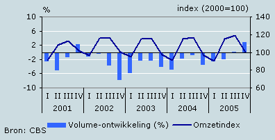 Gecorrigeerd voor prijsstijgingen nam het omzetvolume in het vierde kwartaal met 2,4 procent toe ten opzichte van hetzelfde kwartaal in 2004. Dit is het derde kwartaal op rij dat het omzetvolume toeneemt. Over heel 2005 namen de bestedingen in de horeca toe met 1 procent. Vanaf 2001 tot en met 2004 kende de horeca nog ieder jaar volumedalingen.