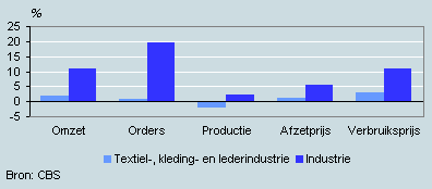 De textiel-, kleding- en lederindustrie heeft in maart 2 procent meer omzet geboekt dan in maart 2005. Dat is vooral te danken aan de ruim 3 procent hogere buitenlandse omzet. Binnen onze landsgrenzen werd vrijwel even veel omgezet als in maart vorig jaar. Maart telde dit jaar wel één werkdag meer dan in 2005 en bovendien lagen de afzetprijzen hoger. Na verrekening van dit prijs- en werkdageffect kwam het omzetvolume 3,5 procent kleiner uit.