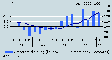 In het eerste kwartaal van 2006 lag de omzet van de uitzendbranche 5 procent hoger dan in het kwartaal daaraan voorafgaand. De seizoengecorrigeerde omzet van deze branche stijgt al acht kwartalen. Alleen het eerste kwartaal van 2005 lag de omzet net wat lager. Dankzij de aanhoudende groei werd 25 procent meer omzet gerealiseerd in het eerste kwartaal van 2006 dan in het eerste kwartaal van het jaar ervoor. De jaaromzet lag in 2005 ook al ruim 14 procent hoger dan in 2004.