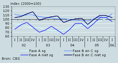 Het aantal gewerkte uren in fase B en C (zie toelichting) steeg in het eerste kwartaal van 2006 bijna 9,5 procent ten opzichte van het laatste kwartaal in 2005. Dit is meer dan de gewerkte uren in fase A die een krappe 3,5 procent toenamen. Sinds de opleving van het uitzendwerk vertoonden de uren in fase B en C afwisselend stijgingen en dalingen. Dit in tegenstelling tot de uitzenduren in fase A die al sinds begin 2004 elke periode stegen. Op jaarbasis zijn er dan ook flinke verschillen in de toename van de uren naar fase. In 2005 werkten arbeidskrachten in fase A 17,5 procent meer dan in 2004 ten opzichte van 3 procent in fase B en C.