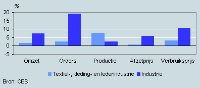 Het volume van de gemiddelde dagproductie van de textiel-, kleding- en lederindustrie was in juli bijna 8 procent groter dan in juli 2005. Daarmee heeft deze branche de grootste productiestijging binnen de industrie. Voor januari tot en met juli 2006 is het productievolume 2,5 procent groter dan voor dezelfde periode in 2005. Dit volume was voor het jaar 2005 nog bijna 4 procent kleiner dan in 2004.