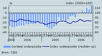 De totale orderontvangsten zijn flink toegenomen van augustus op september. De ondernemers melden op zowel de binnenlandse als buitenlandse markt een forse toename van de orderontvangsten. Hun oordelen over deze orderontvangsten en de orderpositie zijn dan ook iets positiever. De index orderpositie is echter gedaald naar 83,0 (juli 2000=100). In 2006 wordt het beeld in deze branche bepaald door een sterk verbeterd sentiment van de ondernemers.