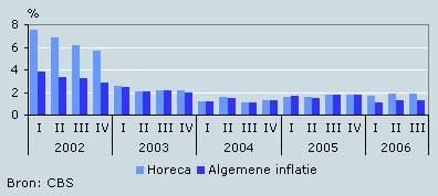 In het derde kwartaal van 2006 stegen de prijzen in de horeca met 1,9 procent ten opzichte van dezelfde periode een jaar eerder. De prijsstijging kwam hiermee op hetzelfde niveau uit als in het tweede kwartaal. Vooral specifieke horecaproducten als groenten en vis werden in het derde kwartaal duurder. Over de eerste drie kwartalen van 2006 lag de prijsontwikkeling in de horeca ongeveer een halve procentpunt hoger dan de ontwikkeling van de algemene inflatie.