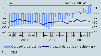 De totale orderontvangsten zijn niet verder toegenomen in oktober, na de flinke toename die in september was gemeld. Hun oordelen over deze orderontvangsten en de orderpositie zijn iets positiever. Ook het oordeel over de voorraad gereed product is iets verbeterd. De index orderpositie is echter gedaald naar 80,8 (juli 2000=100). In 2006 wordt het beeld in deze branche bepaald door een sterk verbeterd sentiment van de ondernemers.