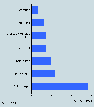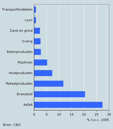In 2006 zijn de kosten voor het aanleggen van asfaltwegen met 14 procent toegenomen. De stijging is beduidend groter dan in 2005, toen de kostenstijging uitkwam op 3,8 procent ten opzichte van een jaar eerder. De sterke stijging in 2006 komt vooral door de prijsstijging van wegenbouwbitumen. Onder invloed van de hoge olieprijzen is deze grondstof 27 procent duurder geworden ten opzichte van 2005.