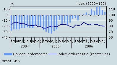 De totale orderontvangsten zijn verder toegenomen in december. Het oordeel van de ondernemers over deze orderontvangsten is echter licht verslechterd. Het oordeel over de voorraad gereed product is licht verbeterd. De index orderpositie is nagenoeg onveranderd en komt uit op 80,1 (juli 2000=100). Het oordeel over deze orderpositie is echter iets verslechterd. In 2006 is het beeld in deze branche bepaald door een sterk verbeterd sentiment van de ondernemers.