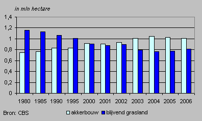 In 2006 was nog ongeveer 60 procent van het Nederlandse landoppervlak in gebruik als landbouwgrond. Dit betekent dat het beheer van ruim 1,9 miljoen hectare grond in handen is van boeren en tuinders. Ruim 1 miljoen hectare is in gebruik voor akkerbouw en ruim 0,8 miljoen hectare is blijvend grasland. In de laatste 25 jaar is het areaal voor akkerbouw toegenomen ten koste van het blijvend grasland. Dit heeft vooral te maken met de sterke toename van het areaal tijdelijk grasland. Dit zijn graspercelen die meedraaien in een vruchtwisselingscyclus voor de teelt van akkerbouwgewassen. Gemiddeld staat er op dergelijke percelen maar eens in de vier jaar gras.