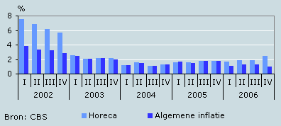 De prijzen in de horeca waren in het vierde kwartaal 2,4 procent hoger in vergelijking met dezelfde periode in 2005. De prijsstijging was hoger dan in de eerdere kwartalen van 2006. Specifieke horecaproducten als groenten, vlees en vis werden duurder. Hierdoor stegen de prijzen in de horeca meer dan de algemene inflatie. Met een gemiddelde prijsstijging van 2 procent over heel 2006 stegen de prijzen iets meer dan een jaar eerder.