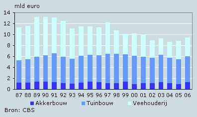 In de laatste 20 jaar lag het groeicijfer van de landbouw in Nederland 0,5 procent gemiddeld per jaar onder dat van de totale economie. Deze groeide 2,7 procent gemiddeld per jaar.Het aandeel van de landbouw in de totale economie liep terug van 4 procent in 1987 naar 2 procent in 2006. In 1987 had de veeteelt nog een belang van 54 procent in de totale landbouw. Voor de tuinbouw was dat 36 procent. In 2006 is dit beeld tegenovergesteld. In 1998 werd de tuinbouw voor het eerst belangrijker dan de veeteelt. Het aandeel van de akkerbouw in de totale landbouw was in de laatste 20 jaar met gemiddeld 11 procent vrij stabiel.