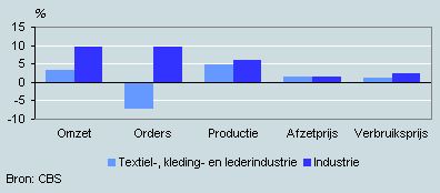 In het vierde kwartaal van 2006 was het volume van de bruto toegevoegde waarde in de textiel-, kleding- en lederindustrie bijna 6 procent groter dan in het vergelijkbare kwartaal van 2005. Over heel 2006 kwam het volume van de bruto toegevoegde waarde 4 procent groter uit dan in 2005. Over het hele jaar 2005 was dit volume nog bijna 4,5 procent kleiner dan in 2004.