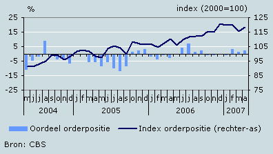 De ondernemers zagen de orderontvangsten in maart toenemen ten opzichte van februari. Het oordeel over deze orderontvangsten is echter onveranderd. De indexorderpositie is licht gestegen, de tevredenheid over de orderpositie en de voorraden zijn onveranderd. Het oordeel over de buitenlandse orderpositie is eveneens nagenoeg gelijk gebleven. Het sentiment onder de ondernemers is in 2007 stabiel.