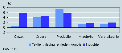 In het vierde kwartaal van 2006 was het volume van de bruto toegevoegde waarde in de textiel-, kleding- en lederindustrie bijna 6 procent groter dan in het vergelijkbare kwartaal van 2005. Over heel 2006 kwam het volume van de bruto toegevoegde waarde 4 procent groter uit dan in 2005. Over het hele jaar 2005 was dit volume nog bijna 4,5 procent kleiner dan in 2004.