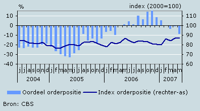 De orderontvangsten zijn in april niet verder toegenomen en zijn gelijk gebleven aan de orderontvangsten in maart. Het oordeel van de ondernemers over de orderontvangsten is iets verslechterd, evenals het oordeel over de voorraad gereed product. De index orderpositie is iets gestegen en komt uit op 87,0 (juli 2000=100). Ook het oordeel over deze orderpositie is iets verslechterd. Over de buitenlandse orderpositie is de tevredenheid ook iets afgenomen. In 2007 wordt het beeld in deze branche bepaald door een positief sentiment van de ondernemers.