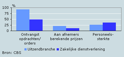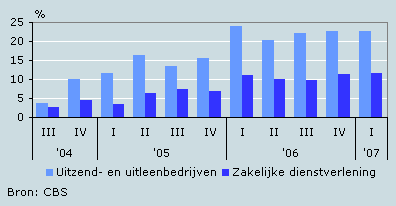 Na een jaar van uitbundige groei bleef in het eerste kwartaal van 2007 de omzet van de uitzend- en uitleenbedrijven fors toenemen ten opzichte van dezelfde periode een jaar eerder. Met een toename van bijna 23 procent groeide de omzet van de uitzendbranche twee keer zo sterk als de omzet van de gehele zakelijke dienstverlening, die met ruim 11 procent steeg. Vanaf het derde kwartaal 2004 is de omzet telkens toegenomen.