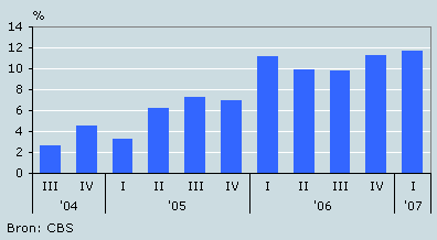 De zakelijke dienstverleners kunnen terugkijken op een zeer goed eerste kwartaal waarin de omzettoename de voorgaande kwartalen overtreft. In vergelijking met het eerste kwartaal van 2006 nam de omzet met bijna 12 procent toe. De juridische en economische dienstverleners en de computerservicebedrijven hebben een belangrijke bijdrage geleverd aan deze omzetgroei. Maar het waren vooral de uitzendbedrijven die evenals voorgaande kwartalen hun stempel drukten op deze ontwikkeling. Met uitzondering van de reclamebureaus hebben alle branches in de zakelijke dienstverlening een positieve bijdrage geleverd aan de omzetontwikkeling in het eerste kwartaal.