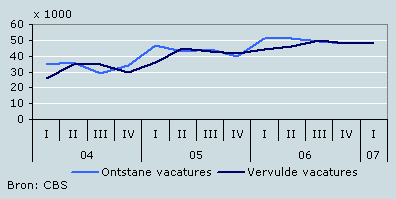 De vraag naar nieuw personeel in de zakelijke dienstverlening blijft hoog. De laatste kwartalen is het aantal ontstane vacatures echter niet meer verder toegenomen maar schommelt rond de 50 duizend. In vergelijking met het eerste kwartaal van 2006 is er een lichte afname waar te nemen. De zakelijke dienstverleners hebben steeds meer moeite met het opvullen van hun vacatures. Stonden er in het eerste kwartaal van 2006 nog 41 duizend vacatures open, een jaar later is dit aantal verder opgelopen tot bijna 48 duizend. Vooral bij de juridische en economische dienstverleners en de architecten en ingenieurs is het aantal openstaande vacatures erg hoog. Hier waren in het eerste kwartaal bijna 22 duizend niet vervulde vacatures. Dat is bijna de helft van alle openstaande vacatures in de zakelijke dienstverlening.