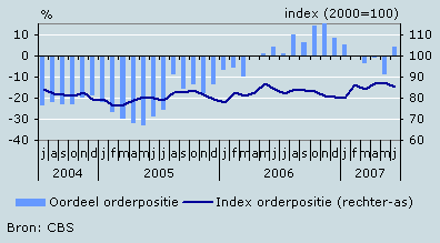 De orderontvangsten zijn in mei flink toegenomen ten opzichte van die van april. Het oordeel van de ondernemers over de orderontvangsten is dan ook verbeterd, evenals het oordeel over de voorraad gereed product. De index orderpositie is echter iets gedaald en komt uit op 85,3 (juli 2000=100). Het oordeel over deze orderpositie is wel iets verbeterd. Ook over de buitenlandse orderpositie is de tevredenheid toegenomen. In 2007 wordt het beeld in deze branche bepaald door een positief sentiment van de ondernemers.