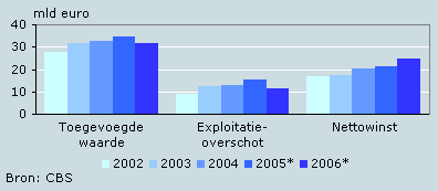 De banken hadden te maken met een daling van de productiewaarde van hun financiële dienstverlening. Doordat de kortlopende rente opliep, stond in 2006 de rentemarge onder druk. De productie van verzekeraars en pensioenfondsen daarentegen steeg licht. Bij de verzekeringsinstellingen namen de verzekeringspremies sterk af door de wijziging in het zorgstelsel. Zij hadden echter ook minder verzekeringsuitkeringen, waardoor de productiewaarde (grofweg het saldo van premies en uitkeringen) steeg. Zij boekten een verlies op hun zorgverzekeringen in het eerste jaar van het nieuwe zorgstelsel. Per saldo was de productiewaarde van alle financiële instellingen samen lager dan een jaar eerder. Daar tegenover stond een stijging van de verbruiks- en loonkosten. Het resultaat was dat het exploitatieoverschot van de financiële instellingen daalde met bijna 4 miljard euro tot 11,6 miljard euro.