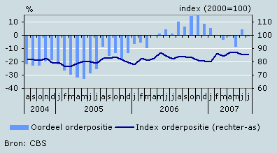 De orderontvangsten zijn volgens de ondernemers in juni wederom toegenomen. Het oordeel van de ondernemers over de orderontvangsten is dan ook positief, evenals het oordeel over de voorraad gereed product. De index orderpositie is iets gestegen en komt uit op 85,9 (juli 2000=100). Het oordeel over deze orderpositie is echter iets verslechterd. Over de buitenlandse orderpositie is de tevredenheid iets toegenomen. In 2007 wordt het beeld in deze branche bepaald door een positief sentiment van de ondernemers.