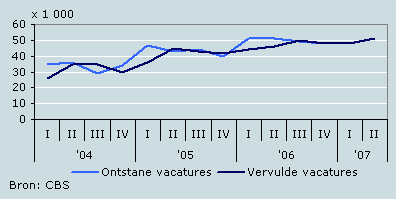 De vraag naar nieuw personeel in de zakelijke dienstverlening steeg in het tweede kwartaal van 2007 opnieuw. Het aantal ontstane vacatures bedroeg aan het einde van het tweede kwartaal 51 duizend. Omdat het steeds moeilijker wordt om de beschikbare vacatures opgevuld te krijgen loopt het aantal openstaande vacatures elk kwartaal verder op. Aan het einde van het tweede kwartaal 2007 stonden 49 duizend vacatures open, bijna 4 duizend meer dan in het tweede kwartaal van 2006. Vooral bij de juridische en economische dienstverleners en bij de architecten en ingenieurs blijft het aantal openstaande vacatures erg hoog. Eind juni telden deze twee branches bijna de helft van alle openstaande vacatures.