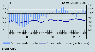 De orderontvangsten zijn volgens de ondernemers in augustus afgenomen ten opzichte van juli, wat voor de tijd van het jaar echter niet ongewoon is. Het oordeel van de ondernemers over de orderontvangsten is dan ook onveranderd positief. Het oordeel over de voorraad gereed product is gelijk gebleven. De index orderpositie is iets gestegen en komt uit op 83,5 (juli 2000=100). Het oordeel over de orderpositie is iets verslechterd. Over de buitenlandse orderpositie is de tevredenheid onveranderd groot. In 2007 wordt het beeld in deze branche bepaald door een positief sentiment van de ondernemers.