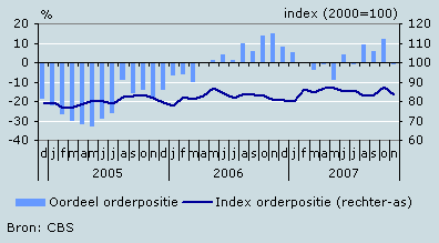 De orderontvangsten zijn volgens de ondernemers in oktober niet verder toegenomen. Het oordeel van de ondernemers over de orderontvangsten is dan ook negatiever dan vorige maand. Het oordeel over de voorraad gereed product is gelijk gebleven. De index orderpositie is flink gedaald van 87,6 naar 83,4 (juli 2000=100). Het oordeel over de orderpositie is dan ook verslechterd. Over de buitenlandse orderpositie is de tevredenheid groot. In 2007 wordt het beeld in deze branche bepaald door een positief sentiment van de ondernemers.