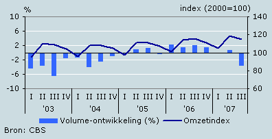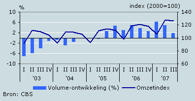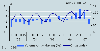 De omzet van de horeca is dit kwartaal, na een lange periode van flinke groei, minder sterk toegenomen. In vergelijking met het derde kwartaal van 2006 nam de omzet met 2,7 procent toe. De hotels en restaurants boekten de hoogste omzetgroei. De cafetaria’s en cafés daarentegen boekten door de natte zomer slechte resultaten. De prijzen in de horeca stegen met 3,2 procent, het volume van de omzet kwam 0,6 procent lager uit. Het is voor het eerst sinds het tweede kwartaal van 2005 dat het volume is afgenomen.