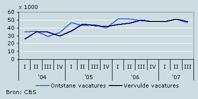Het aantal openstaande vacatures in de zakelijke dienstverlening is in het derde kwartaal, na zes kwartalen van toename, licht gedaald. Desondanks waren er aan het einde van het derde kwartaal ruim 47 duizend vacante banen. In vergelijking met het derde kwartaal van 2006 een stijging van bijna 2 duizend. Het aantal vacatures is in het derde kwartaal met 47 duizend nog steeds hoog. De juridische en economische dienstverleners en de architecten en ingenieurs zijn de branches waar de vraag naar nieuw personeel het grootst is. Bijna de helft van de openstaande vacatures komt voor rekening van deze bedrijven.