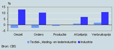 De waarde van de orderontvangsten van de textiel-, kleding- en lederindustrie was in oktober 2,5 procent lager dan in dezelfde maand in 2006. In de eerste drie kwartalen van 2007 groeide de waarde van de orderontvangsten steeds minder. Vanaf september lag de waarde van de ontvangen orders zelfs onder die van een jaar eerder.