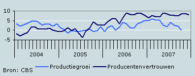 In het derdekwartaal van 2007 was het volume van de bruto toegevoegde waarde (basisprijzen) van de industrie 2,2 procent groter dan dat van het overeenkomstige kwartaal van 2006. Daarmee bleef het groeitempo iets onder dat van het tweede kwartaal van 2007. In het tweede kwartaal van 2007 groeide het volume van de bruto toegevoegde waarde van de Nederlandse industrie nog met 2,5 procent. In het eerste kwartaal van 2007 was de groei 4,4procent. In 2006 kwam de groei van het volume van de bruto toegevoegde waarde in de industrie uit op 2,3 procent.