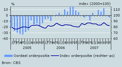 De orderontvangsten zijn volgens de ondernemers in november licht toegenomen. Het oordeel van de ondernemers over de orderontvangsten is echter nagenoeg onveranderd. Het oordeel over de voorraad gereed product is verbeterd. De index orderpositie is gedaald van 83,4 naar 82,1 (juli 2000=100). Het oordeel over de orderpositie is dan ook licht verslechterd. Met name het oordeel over de buitenlandse orderpositie is flink verslechterd. In 2007 wordt het beeld in deze branche bepaald door een positief sentiment van de ondernemers.