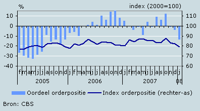De orderontvangsten zijn volgens de ondernemers in december licht toegenomen ten opzichte van november. Het oordeel van de ondernemers over de orderontvangsten is echter verslechterd, net als het oordeel over de voorraad gereed product is verbeterd. De index orderpositie is verder gedaald naar 79,3 (juli 2000=100). Het oordeel over de orderpositie is dan ook verslechterd. Alleen het oordeel over de buitenlandse orderpositie is iets verbeterd. In 2007 wordt het beeld in deze branche bepaald door een positief sentiment van de ondernemers.