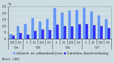 Na een lange periode met groeistijgingen is er sinds het tweede kwartaal van 2007 sprake van een afname van omzetgroei in de uitzendbranche. Het vierde kwartaal was het derde op rij waarbij de omzetgroei rond de twee procentpunten lager lag dan de groei van het kwartaal eraan voorafgaand. De omzetgroei in deze branche is nog steeds bijna twee maal zo hoog als de omzetgroei van de totale zakelijke dienstverlening, maar bereikte in het vierde kwartaal desalniettemin het laagste groeiniveau sinds eind 2005. Ook over het jaar 2007 als geheel was de uitzendbranche met een groei van bijna 20 procent de best presterende branche binnen de zakelijke dienstverlening.