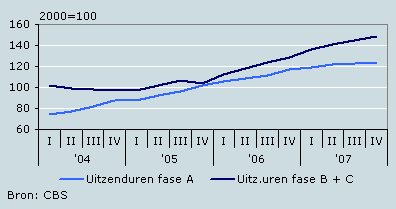 De groei van het totale aantal uitzenduren lag het vierde kwartaal met 8,4 procent voor het eerst sinds het eerste kwartaal van 2005 onder de 10 procent. Dit was opnieuw het gevolg van de aanzienlijk minder sterke groei van de uitzenduren (fase A) welke nog slechts 5 procent bedroeg. Dit was de laagste groei in ruim 3 jaar tijd. De detacheringsuren (fase B+C) aan de ander kant vertoonden wederom een sterke groei van bijna 15 procent ten opzichte van het vierde kwartaal van 2006. Daarmee vlakt de groei van de detacheringsuren ook licht af in de loop van 2007, maar beduidend minder dan van de uitzenduren. Door de economische groei in Nederland gedurende de afgelopen periode blijken steeds meer bedrijven genegen om personeel een vastere aanstelling te geven ten nadele van meer vrijblijvende uitzendcontracten. Over 2007 als geheel beschouwd bedroeg de groei in het totaal aantal uitzenduren 13 procent tegenover ruim 17 procent over 2006.